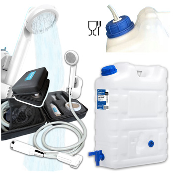 SimplyCan Prysznic turystyczny bezprzewodowy z akumulatorem Water2go + Pojemnik na wodę pitną 20L ATEST kanister z kranikiem (max. 22L)
