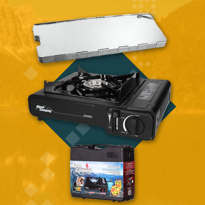 ALPEN CAMPING Kuchenka turystyczna BAVARIA IT001 + ALPEN CAMPING Osłona przeciwwiatrowa do kuchenki turystycznej + ALPEN CAMPING Kartusz Gazowy IK1004 400ml 227g x4 + IMEX Nakładka grillowa 30,5cm x1