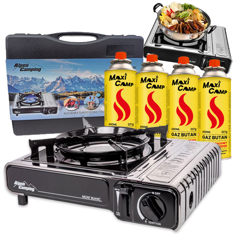ALPEN CAMPING Kuchenka turystyczna MONT BLANC x1 + MAXI CAMP Kartusz Gazowy 400ml 227g x4