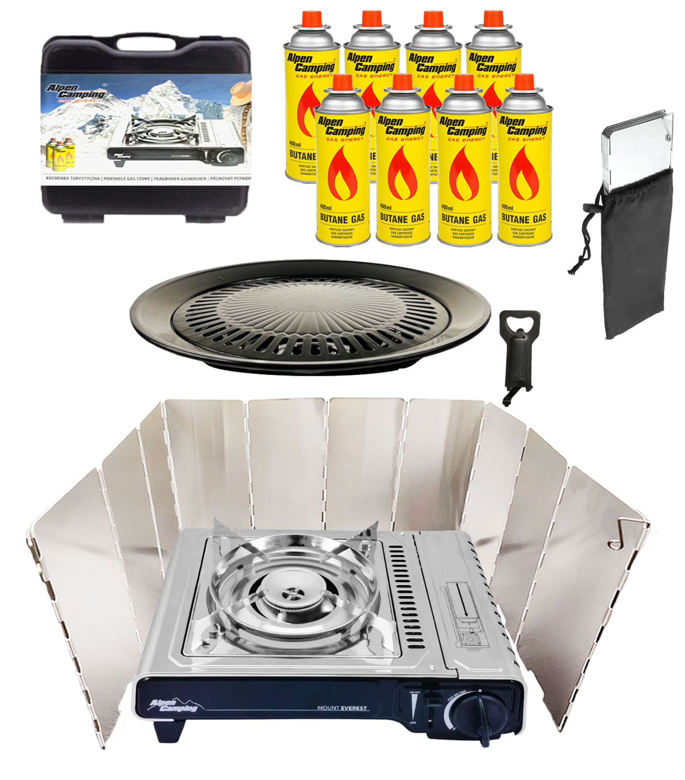 ALPEN CAMPING Kuchenka turystyczna MOUNT EVEREST + ALPEN CAMPING Osłona przeciwwiatrowa do kuchenki turystycznej + ALPEN CAMPING Kartusz Gazowy IK1004 400ml 227g x8 + IMEX Nakładka grillowa 30,5cm x1