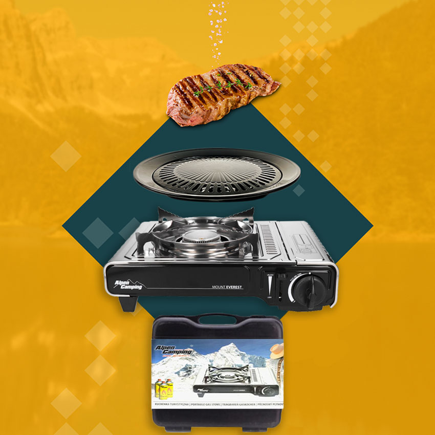 ALPEN CAMPING Kuchenka turystyczna MOUNT EVEREST x1 +  IMEX Nakładka grillowa 30,5cm x1