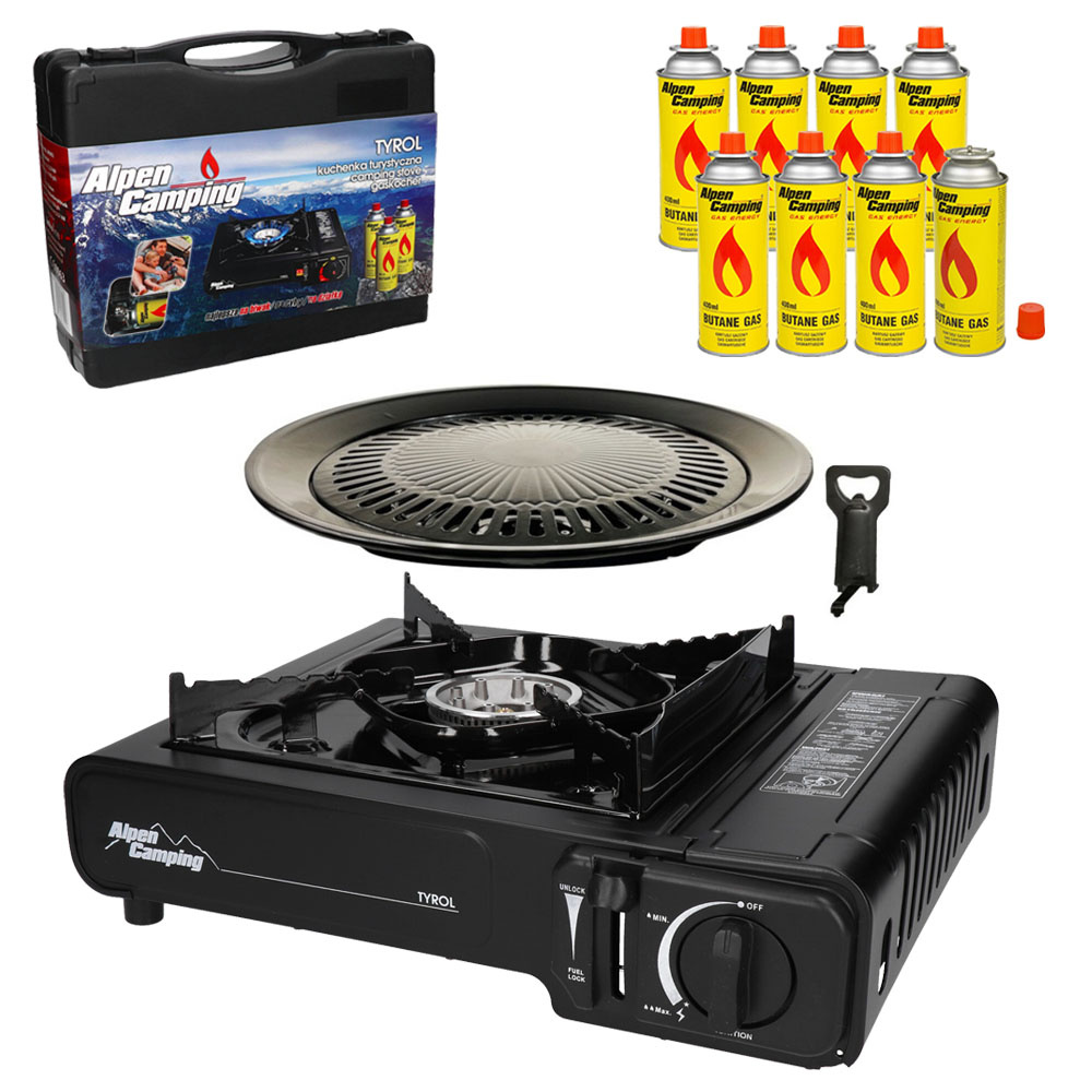 ALPEN CAMPING Kuchenka turystyczna TYROL IK002 x1 + ALPEN CAMPING Kartusz Gazowy IK1004 400ml 227g x8 + IMEX Nakładka grillowa 30,5cm x1
