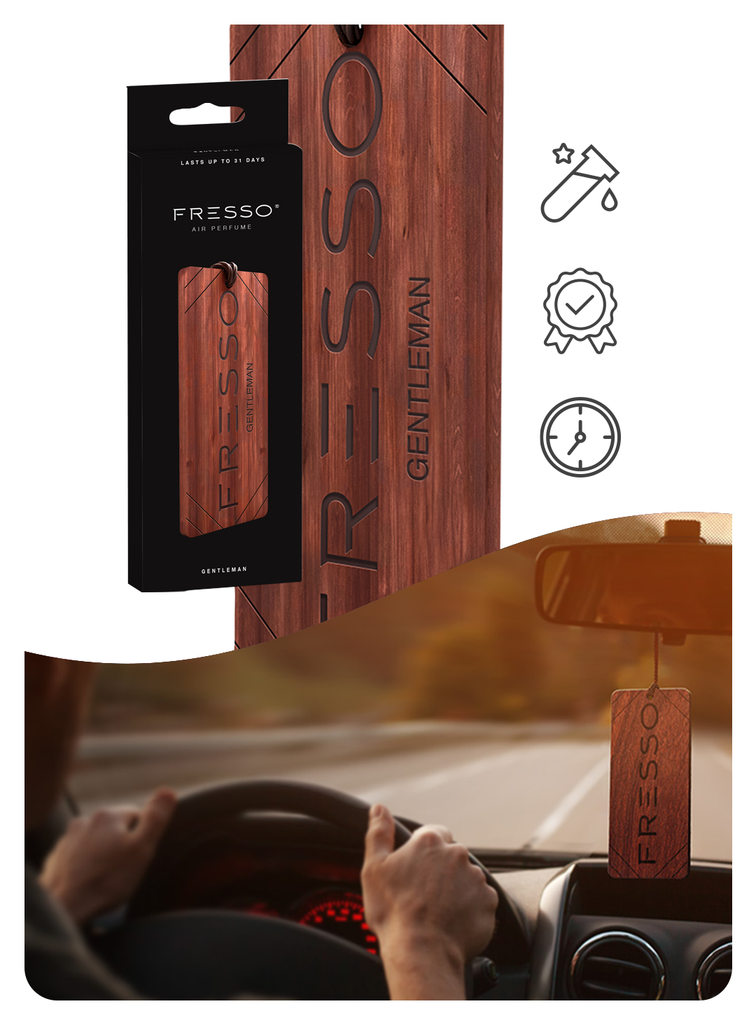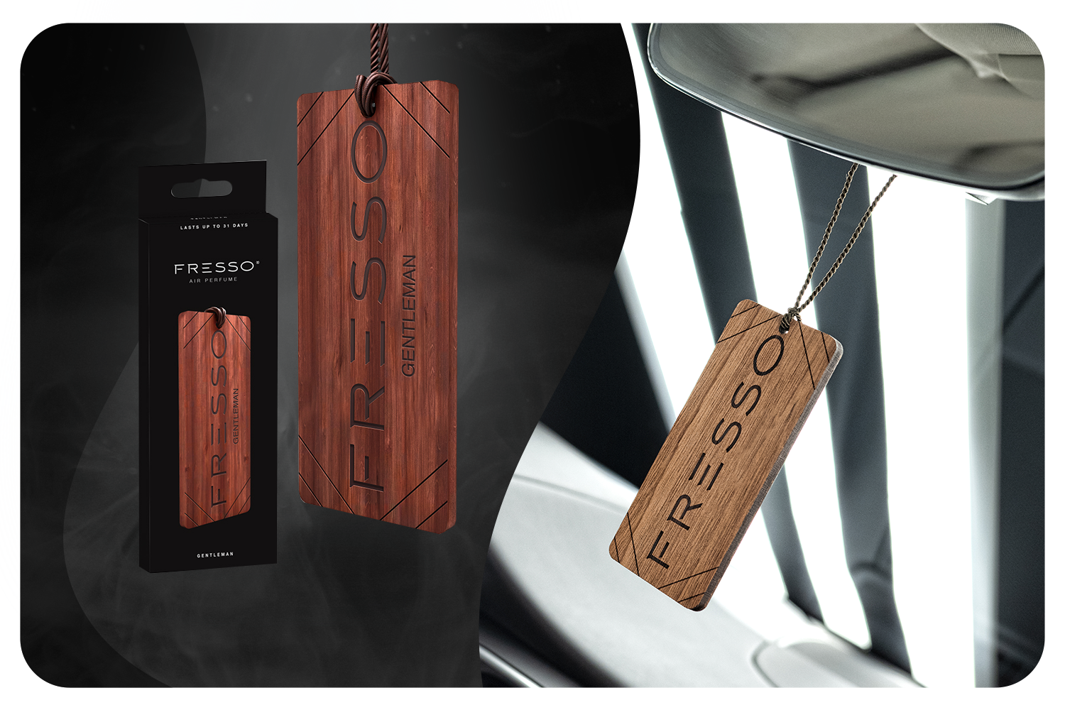 Zawieszkę marki Fresso wyróżnia, subtelny trwały zapach oraz elegancki wygląd, który będzie doskonale prezentować się w każdym aucie. Przyjemny aromat wewnątrz samochodu umili Ci czas podczas podróży oraz zwiększy komfort jazdy.