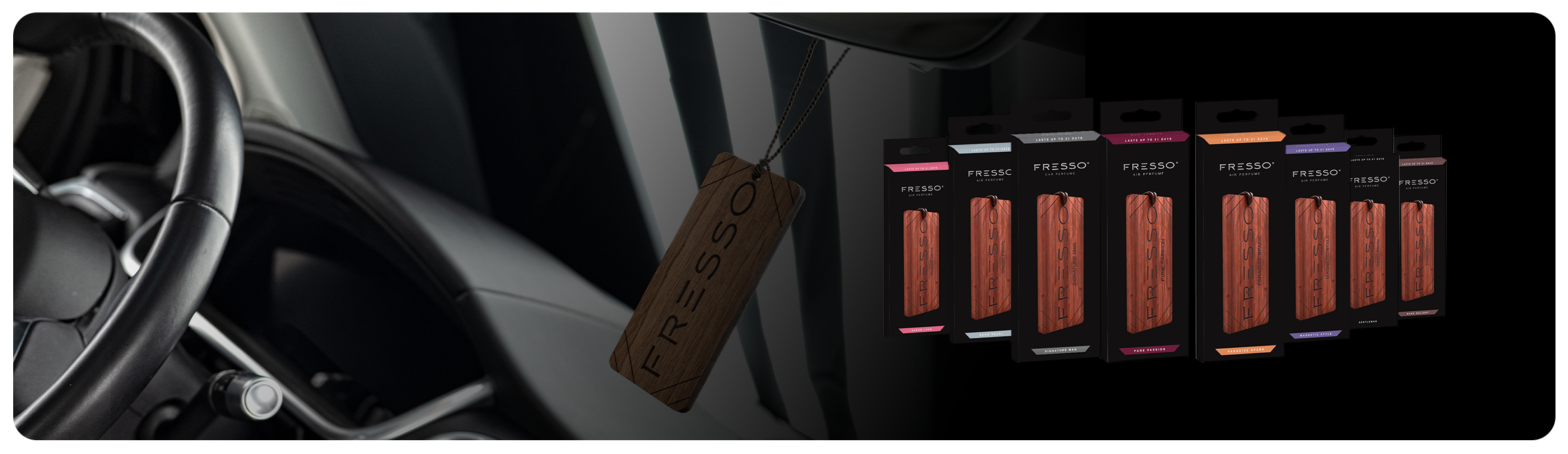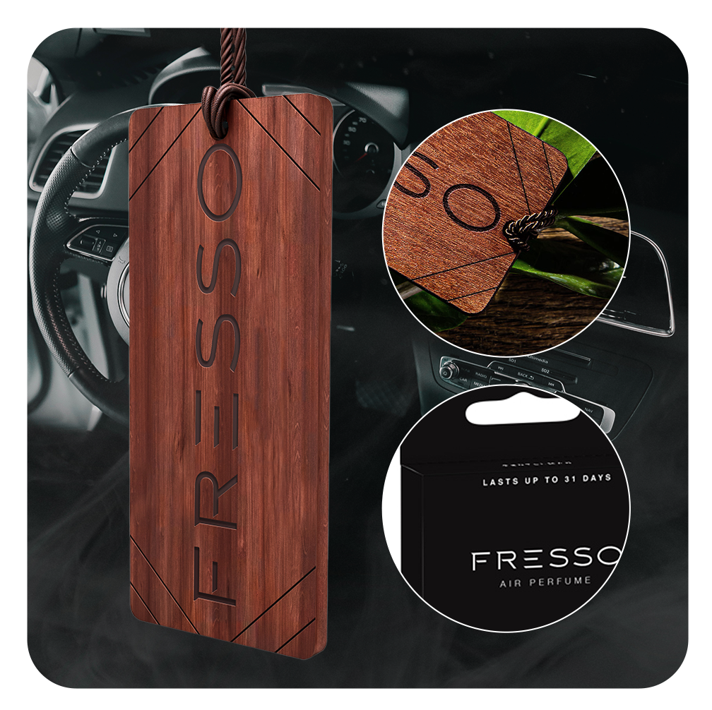 Zawieszkę marki Fresso wyróżnia, subtelny trwały zapach oraz elegancki wygląd, który będzie doskonale prezentować się w każdym aucie. Przyjemny aromat wewnątrz samochodu umili Ci czas podczas podróży oraz zwiększy komfort jazdy.