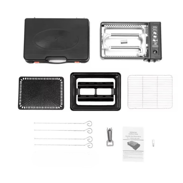 W komplecie otrzymujesz grill, 4 chromowane, długie szpilki do szaszłyków oraz praktyczny uchwyt z otwieraczem i instrukcję obsługi. Idealny zestaw na każdą wyprawę!