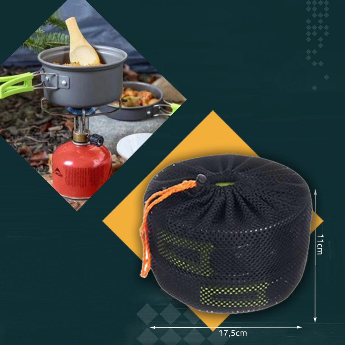 - worek ze sznurkiem i stoperem umożliwia przymocowanie naczyń do torby lub plecaka.