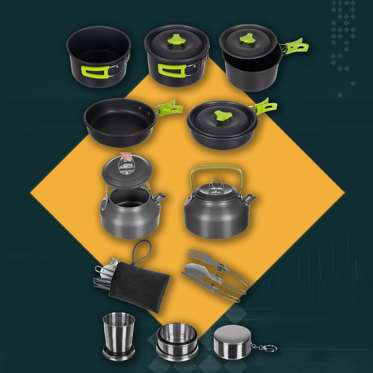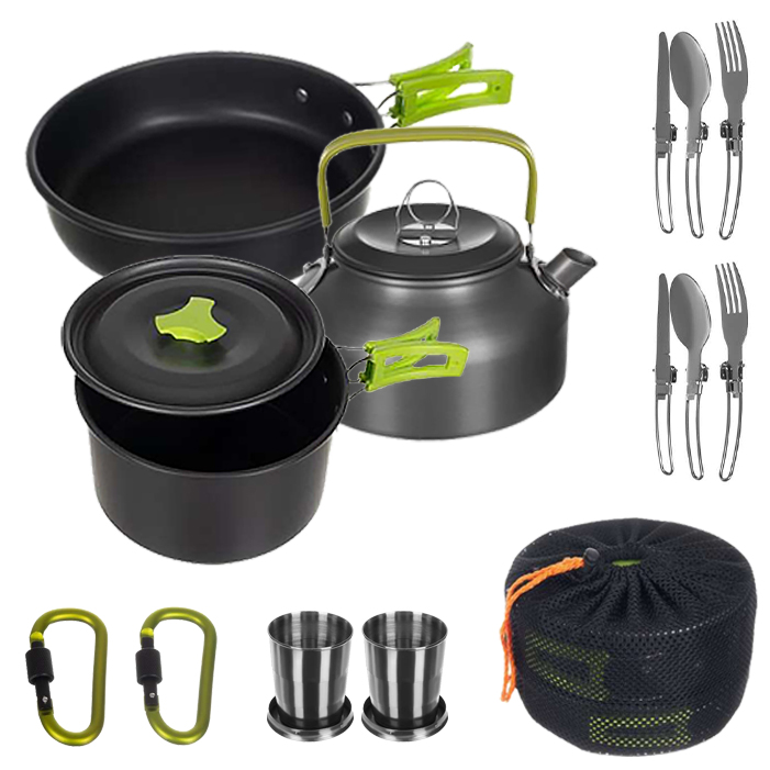 czajnik + pokrywka, garnek, kubek, patelnia, pokrywka (uniwersalna pasuje do garnka i patelni), 2x nóż, 2x widelec, 2x łyżka, 2x karabińczyk, 2x kubek, 2x etui na sztućce, etui / worek ze sznurkiem i stoperem
