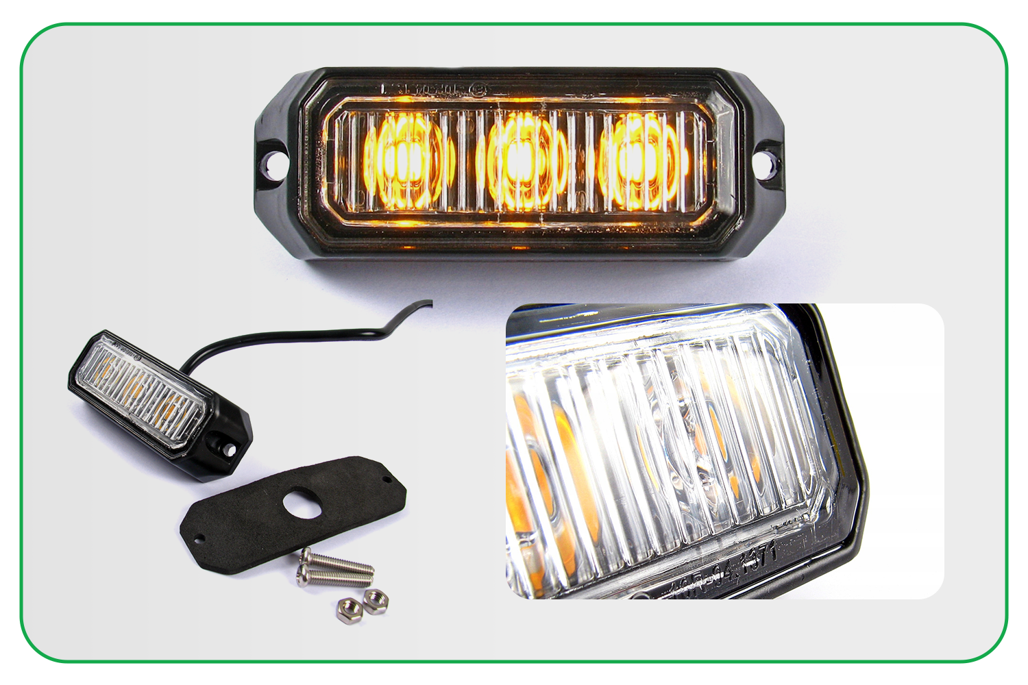 Lampa ostrzegawcza charakteryzuje się poborem mocy w wysokości 9W oraz napięciem 12/24 V. Wyposażone zostało w 3 diody LED oraz funkcje: 4 błyski ostrzegawcze.