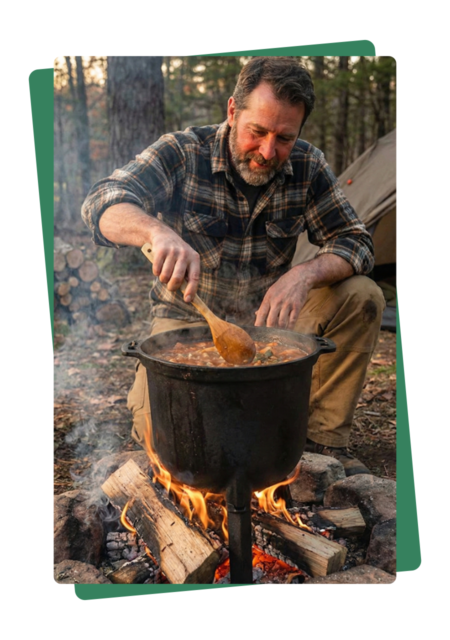 ✅ Po każdym użyciu natychmiast umyj kociołek, dokładnie osusz i zabezpiecz cienką warstwą oleju jadalnego – dzięki temu żeliwo pozostanie w doskonałym stanie przez lata.