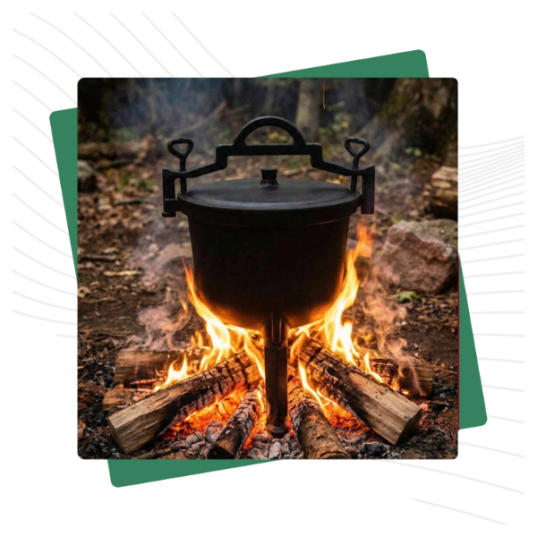 ➡️ Gdzie można używać kociołka? Kociołek nadaje się do użytku w ognisku, na palenisku, piecach oraz do zawieszenia nad źródłem ognia.