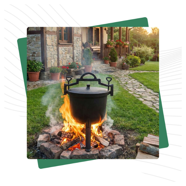 ➡️ Gdzie można używać kociołka? Kociołek nadaje się do użytku w ognisku, na palenisku, piecach oraz do zawieszenia nad źródłem ognia.