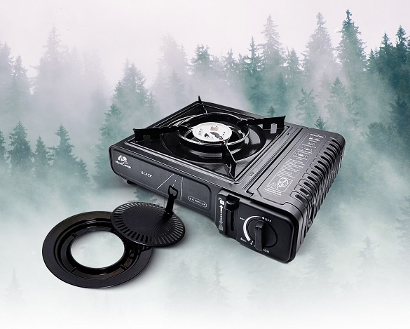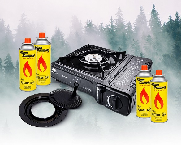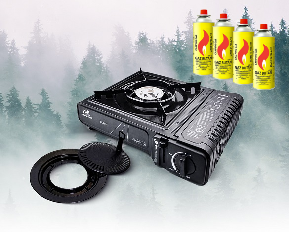 Zestaw turystyczny MaxiCamp: Kuchenka turystyczna gazowa na kartusz BLACK + Nakładka grillowa + 4 x kartusz gazowy