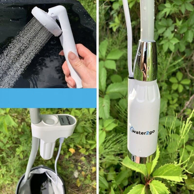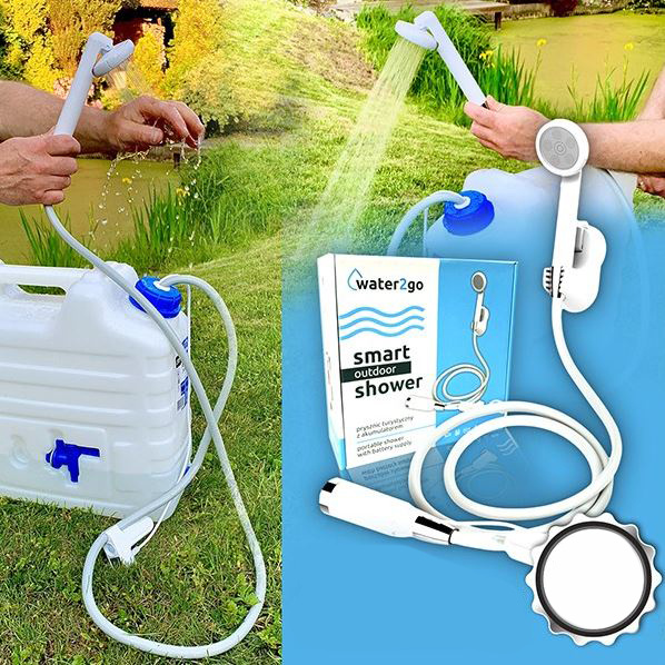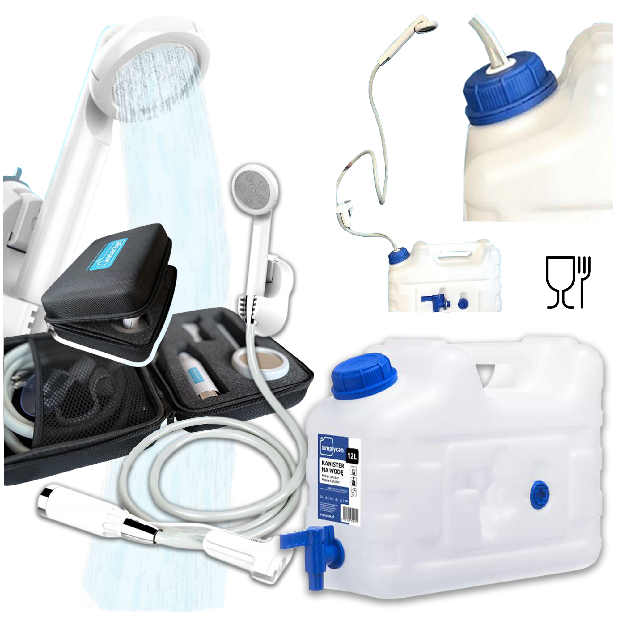 SimplyCan Prysznic turystyczny bezprzewodowy z akumulatorem Water2go + Pojemnik na wodę pitną 10L ATEST kanister z kranikiem (max. 12L)