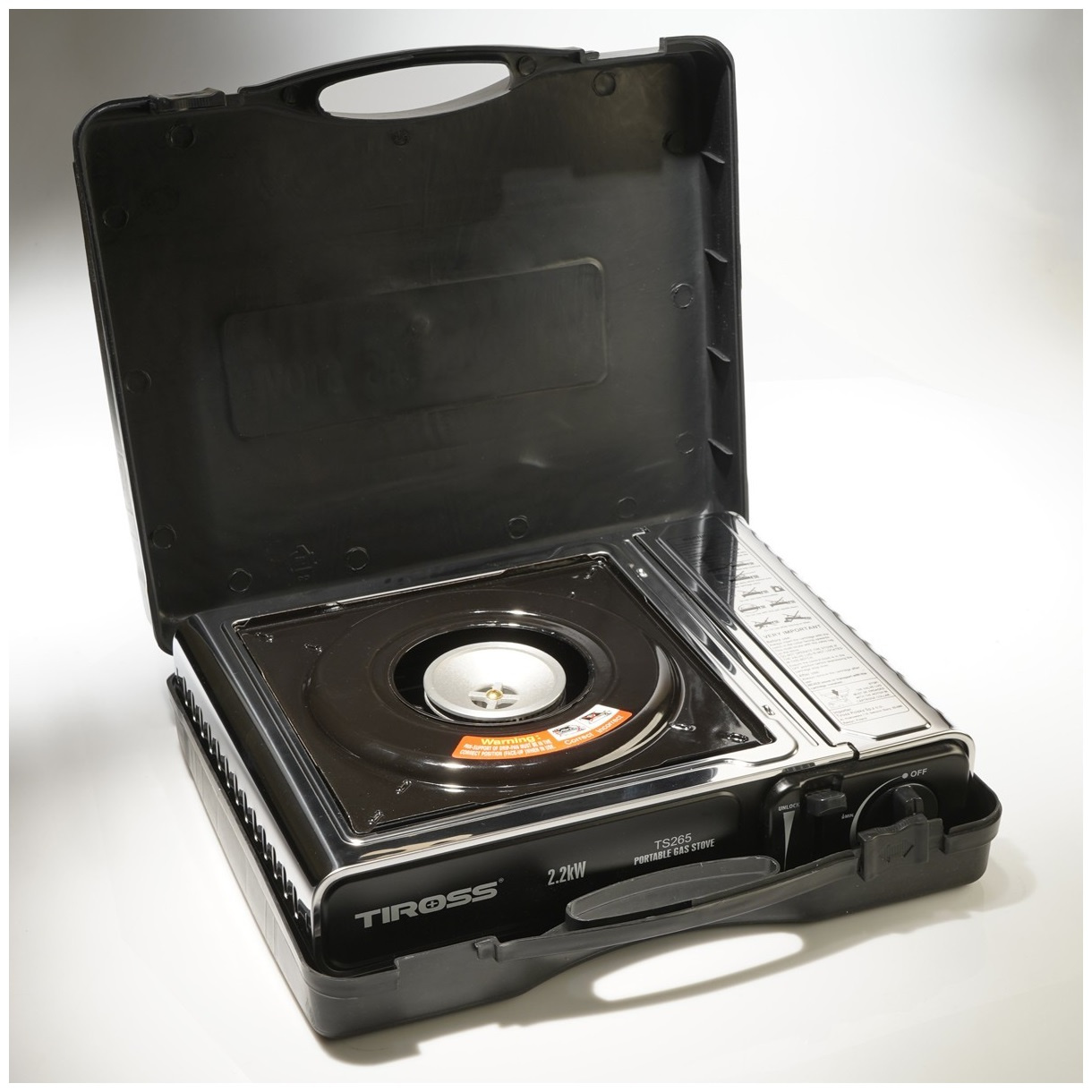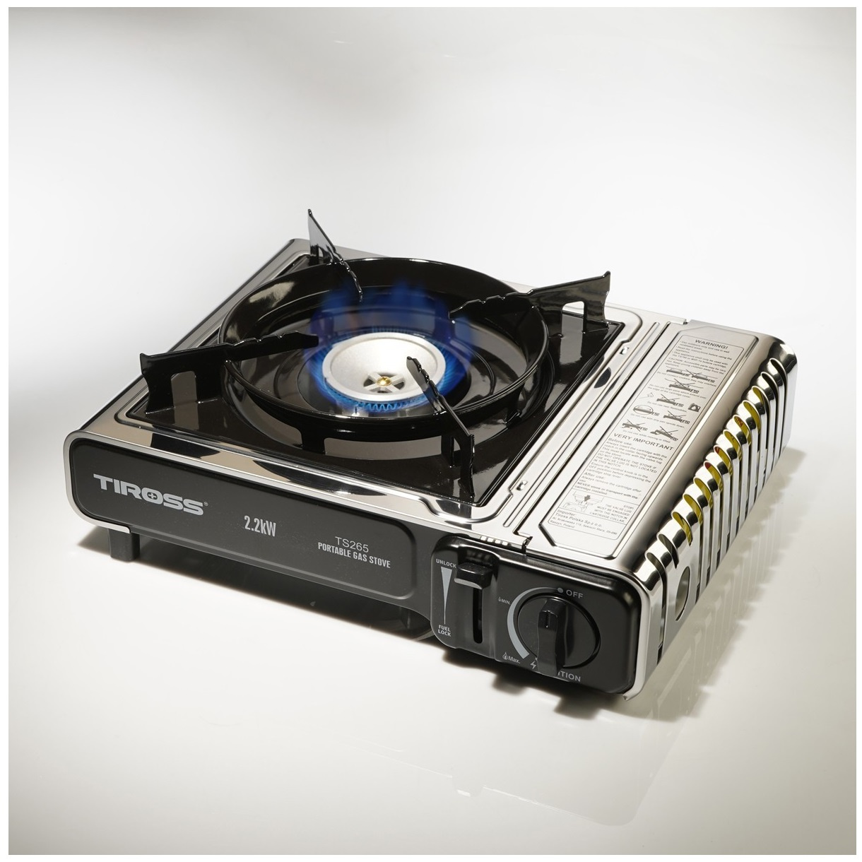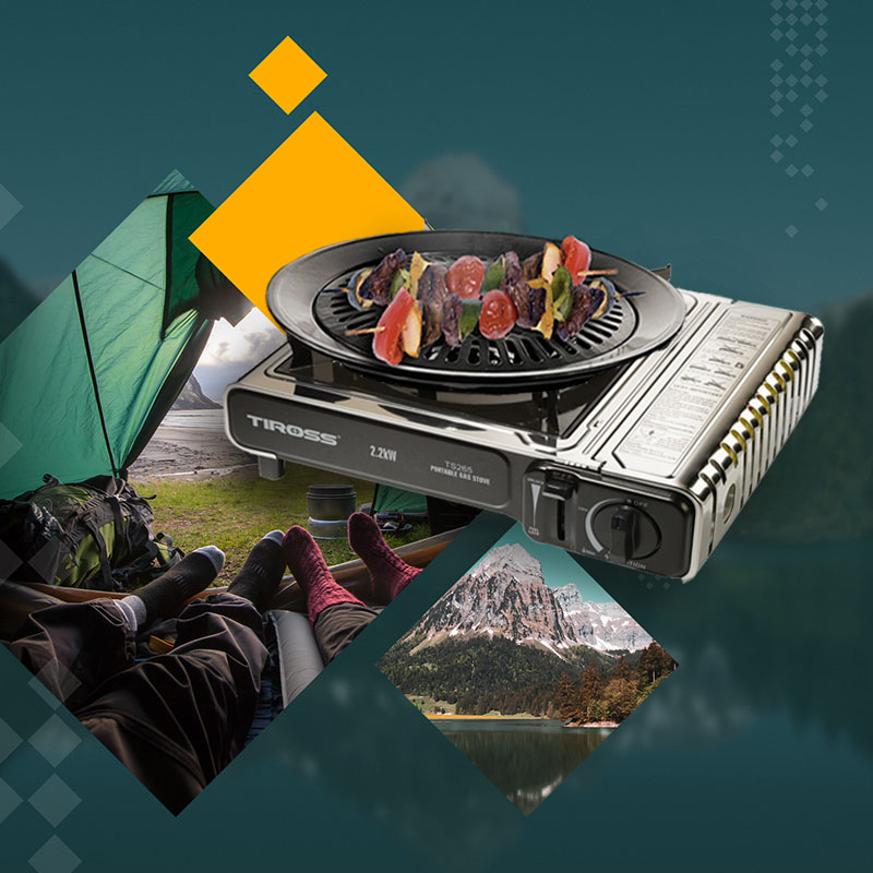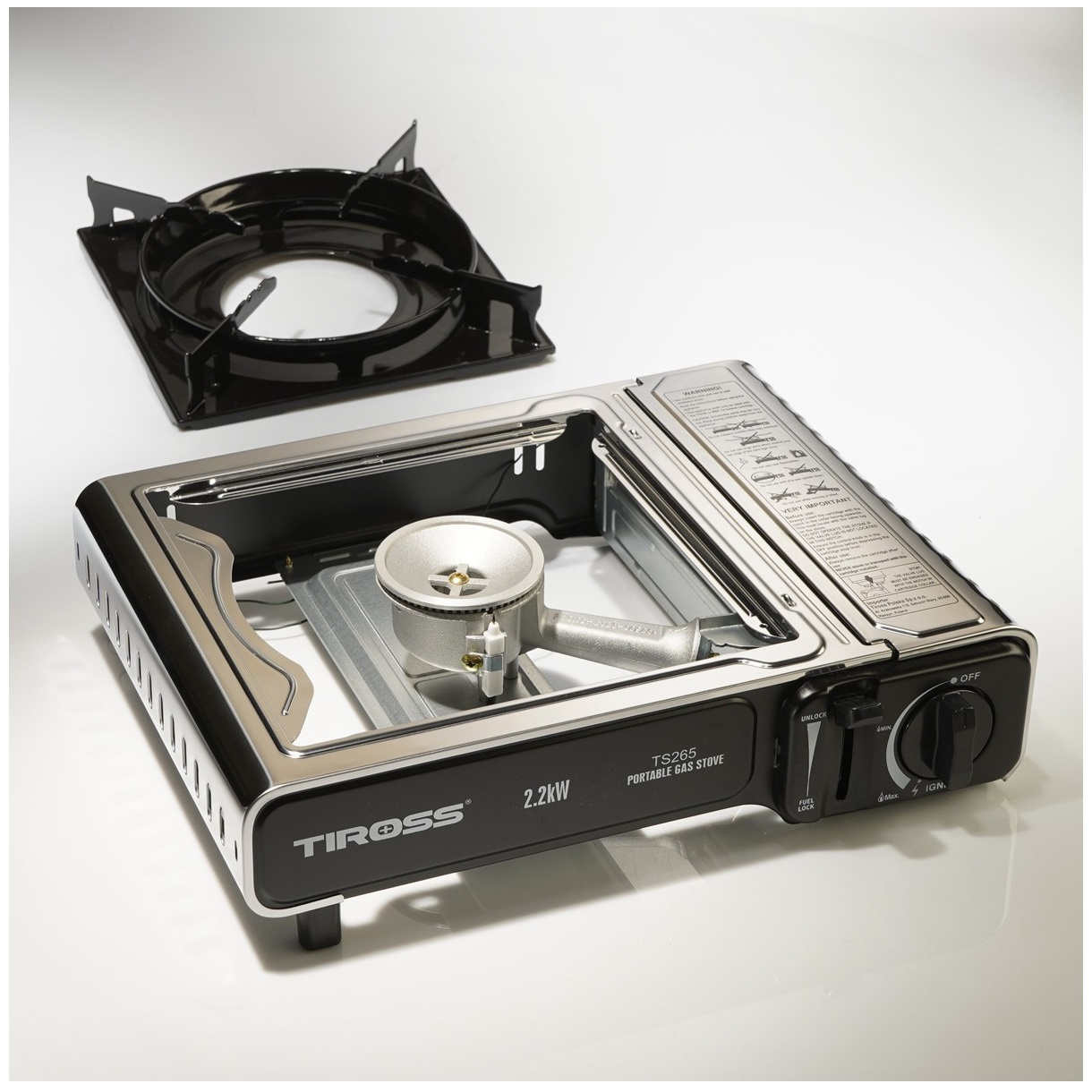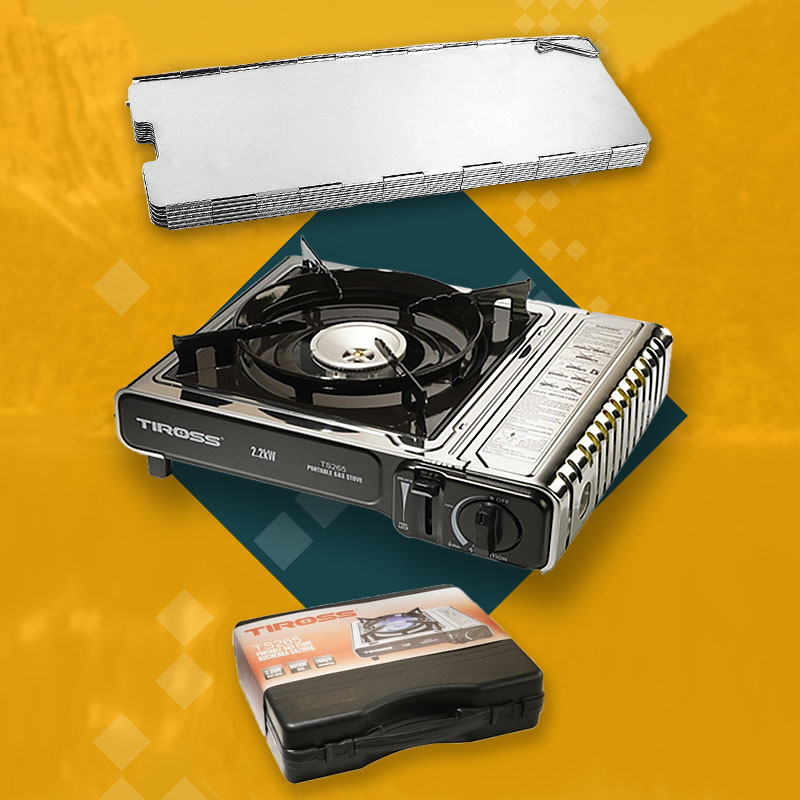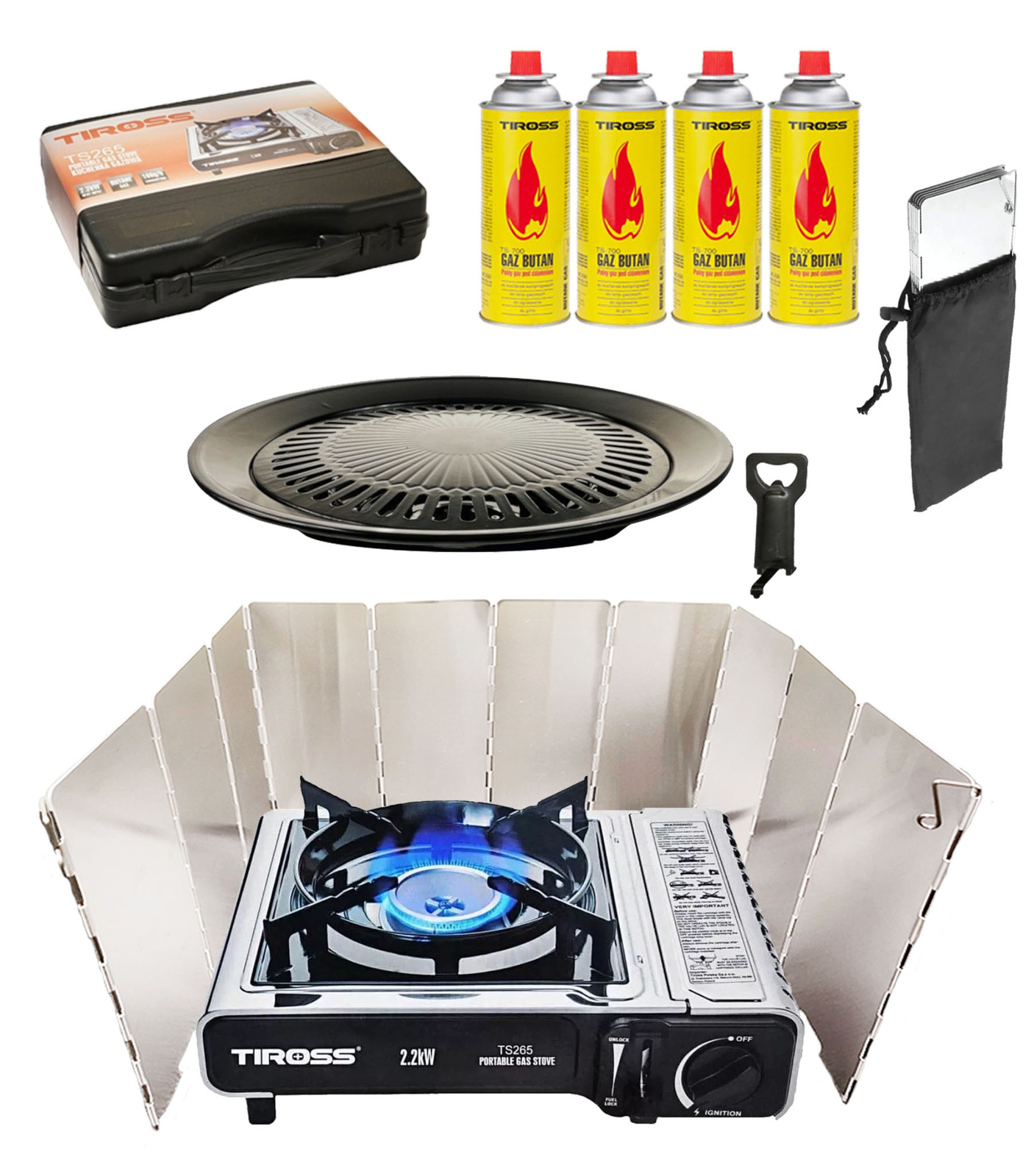 TIROSS Kuchenka turystyczna TS-265 x1 + ALPEN CAMPING Osłona przeciwwiatrowa do kuchenki turystycznej x1 + TIROSS Kartusz Gazowy TS700 400ml 227g x4 + IMEX Nakładka grillowa 30,5cm x1
