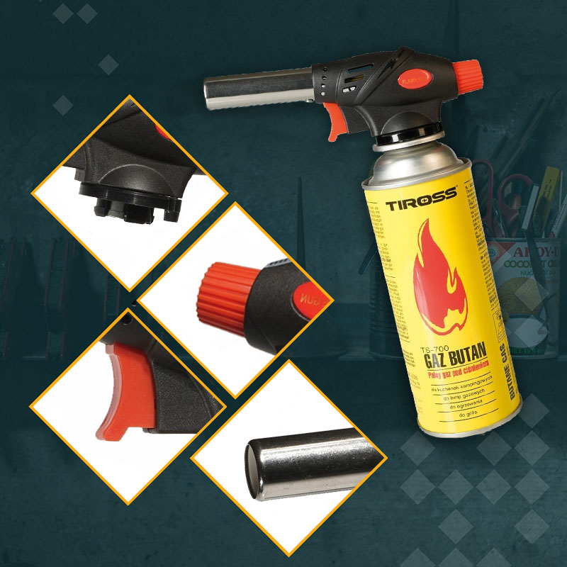 ➡️ Lutownica gazowa marki TIROSS o mocy 1000W wyposażona została w piezo zapalarkę, metalowy zawór oraz pokrętło regulacji siły płomienia kartusza gazowego.